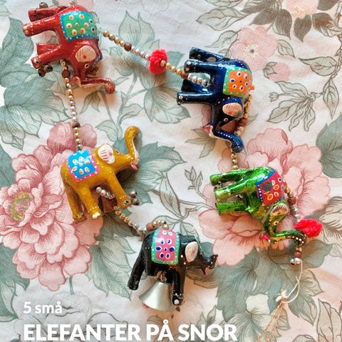 Hængende dekoration med elefanter, perler og klokker.