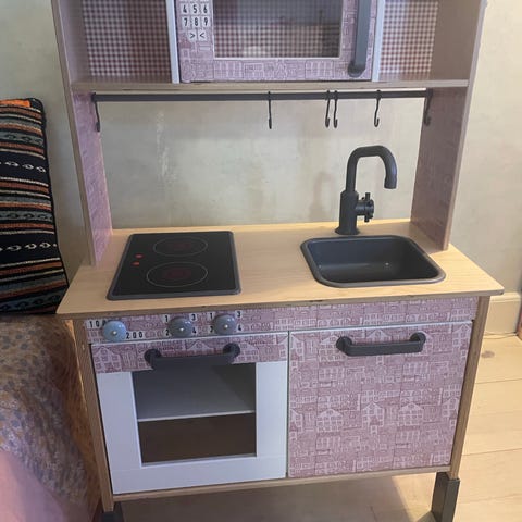 Ikea legekøkken med tilbehør kan sende et bedre billede af tilbehøret vis man skriver til mig. Der er enkelte vand skader på køkkenet☺️