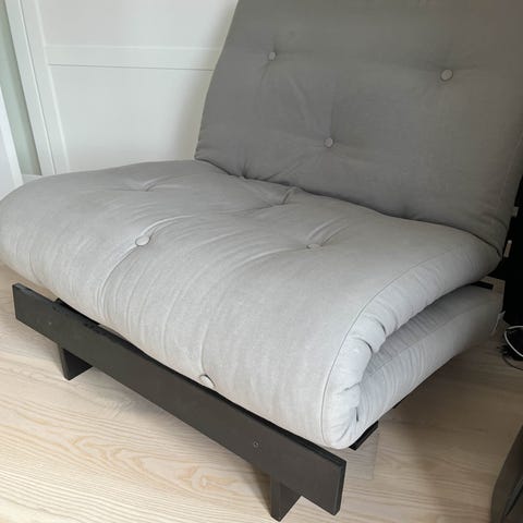 Kan bruges som sofa, seng eller seng med løftet ryg. Stoffet er rødt. Der er et lille hul i madrassen og lidt brugsspor (som set på billederne) men ellers i fin stand!