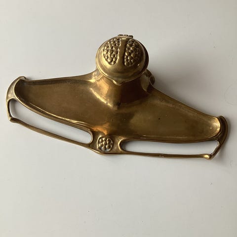 Hvis man er til jugendstil , er her et super smukt blækhus , helt enkel og alligevel ! , er med original glas til blæk , skrift i bund B, WMF, 1/0, OX . mål 15 x 12 x 5 cm . Søgeord! Samler , samleobjekt, antik, indretning, indbo , SENDER KUN MED DAO ELLER AFHENTNING.