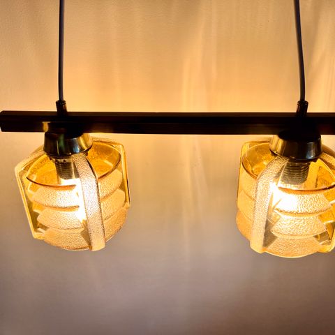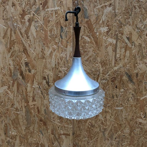 Ret unik pendel i lilla glas med opaline inderglas Top af teak L. 45 cm Bund dia 15 cm
