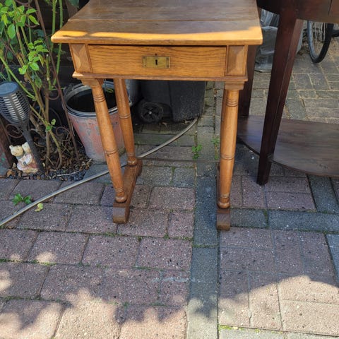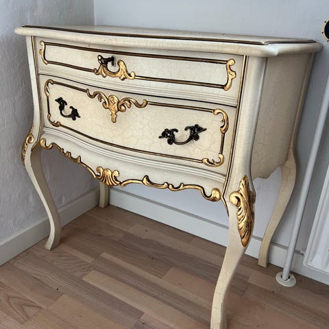 Antik malet træbord med to skuffer og en hylde under bordpladen. Bordet har en grøn bordplade med guldbemaling og dekorative blomsterdetaljer på skufferne. Skufferne har hvide porcelænsknopper. Bordet står på fire ben og har en mørk grøn og rød farve med guldbemaling som dekoration. Bordet kan anvendes som sidebord, konsolbord eller til opbevaring i stue eller entré.