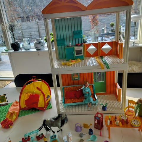 LEGO Scala dukkehus tilbehør med detaljeret indretning inklusive vægdekorationer, dør og tæppe. Passer til LEGO Scala dukkehuse og er designet til børn.