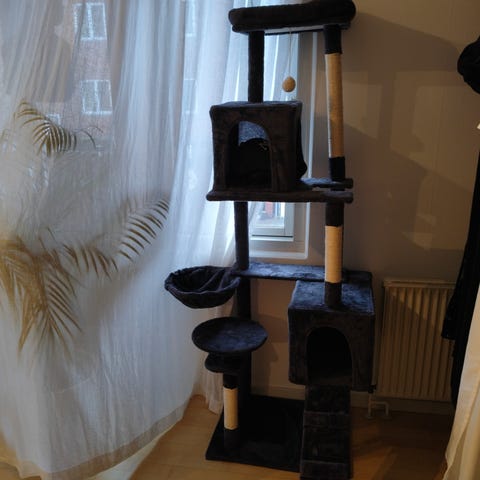 BeOneBreed katteklatretræ med flere niveauer, udstyret med skrabeplader og tæppe. Fremstillet i træ og robust materiale, designet til katte til klatring og leg. Velegnet til indendørs brug som aktivitets- og hvileområde for katte.