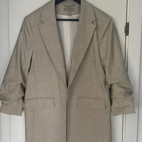 Blazeren er i uldstof/tweed stof i ternet mønster, eller et houndstooth/hundetand/hanefjed mønster. Farverne i stoffet er beige, mørkerød, sort og mørkegrå.