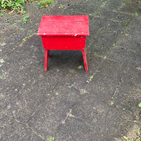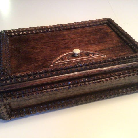 Et sødt lille hænge skab , lavet som husflid , er med tramp art , låge , træ er Gran og cigar træ, Se billede, er med hylde, gammel maling som træ look’ , mål 35 x 23 15 cm, Søgeord ! Samler, samleobjekt, indbo, indretning. SENDER KUN MED DAO ELLER AFHENTNING .