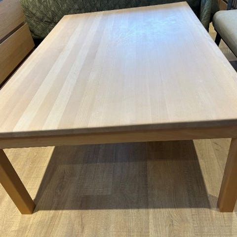 Flot sofabord i lyst træ med plader i begge ender som kan slås ned. Hvis begge er slået op er længden 160 cm