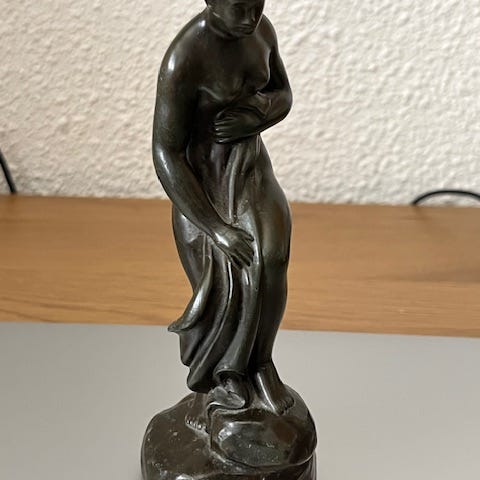 Diskometal, Just Andersen, 1930, D 2096, H 7,7, og 6 x 5 cm, lille smuk figur brugsslidtage nogle små ridser på armen derfor den lave pris / patina, vurdering 800, kom med et bud