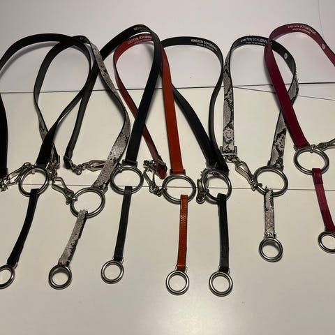 Designers Remix Collection Kvinde bælter i læder i farverne grøn, beige og brun. Bælterne har bredde og justerbare huller til lukning. Designet til kvinder.