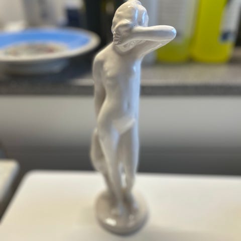 Figur sørgende kvinde, Hjort Keramik Bornholm, Hvidglaseret keramikfigur af en ung nøgen sørgende kvinde Nr. 830 Højde 17 cm.