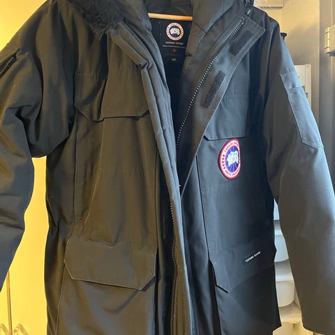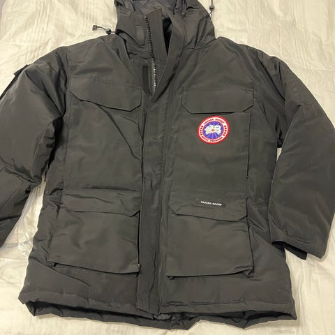 Canada Goose Vinterjakke i størrelse M til herre. Jakken er sort og designet til udendørs brug i vinterforhold. Den har en pelsbeklædt hætte og flere lommer med knaplukning. Jakken er isoleret for at give varme og beskyttelse mod kulde.