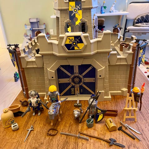 Sammenklappelig Playmobil Ridderborg legetøjssæt med tårn, tre ridderfigurer, hest, og tilbehør inklusive bue, pile, skattekiste med penge, fakler og manual.