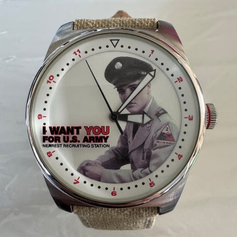 Fresco Elvis Presley ur til ophæng. Pladen måler 40 cm i diameter og er af glas med forgyldte visere og romertal. Det virker perfekt og bruger 1 enkelt AA batteri.