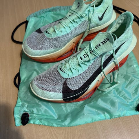 Nike Air Zoom Alphafly Next% 2 løbesko i størrelse 45. Scream Green/ Black. Kun løbet 10 km, som nye i kasse og medfølgende Nike skopose.