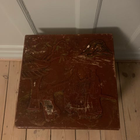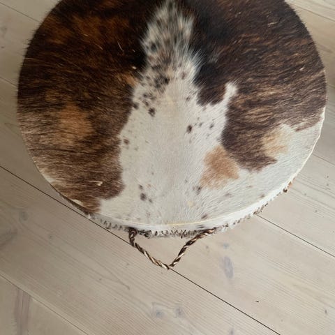 Smuk håndlavet lavt bord beklædt med koskind.