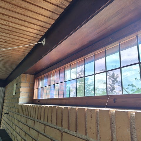 Flot og velholdt blyindfattet vindue med farvede glasruder i grønne, blå, gule og lilla nuancer. Vinduet har en elegant buet top i de øverste felter, som giver et klassisk og charmerende udtryk. Vinduet er med forsatsvindue.