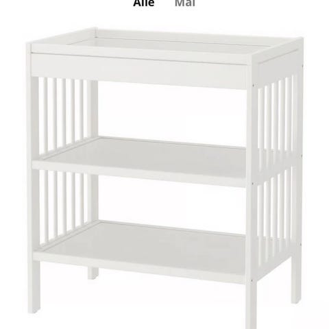 IKEA Skötbord børnemøbel i hvid farve. Skötbordet har flere opbevaringsrum og hylder til organisering af babyartikler. Overfladen er designet til nem rengøring og praktisk brug ved bleskift. Møblet er velegnet til børneværelser og har et kompakt design.