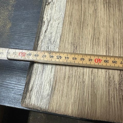 Ubehandlet Eg Planke Træ med dimensioner cirka 230 cm i længden og 50 cm i bredden. Tykkelsen varierer omkring 3 cm. Træet har naturlige knaster og en rå kant, egnet til snedkerarbejde eller hobbyprojekter.