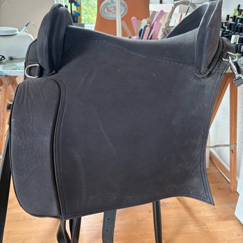 Fin og velholdt sort 17" kombineret/dressursadel fra engelske sadelmageri Sabre sælges fuldt monteret. Super læderkvalitet.