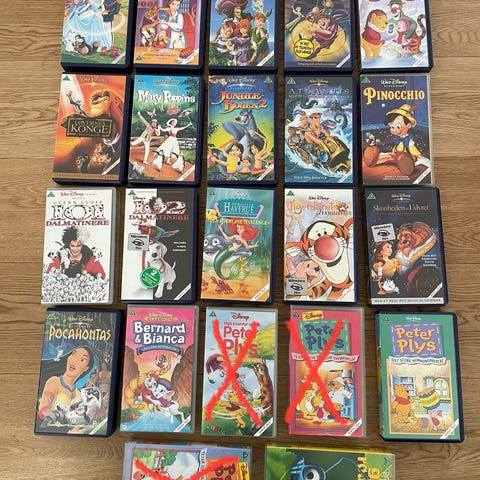 En samling af forskellige film på VHS, med forskellige genrer og titler til hele familie og til hver smag. VHS-kassetter inkluderer både action, drama, komedie, træning, Disney film og thriller.