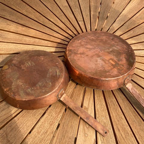 Sæt bestående af to gamle stegepander med træhåndtag i forskellig størrelse.