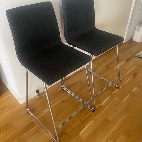 Begge stole er i pæn, brugt stand med almindelige brugsspor. Det enkle, skandinaviske design passer perfekt til køkkenøen, morgenmadsbaren eller et afslappet spiseområde.