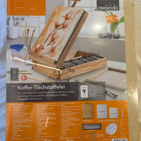 Billede 1-4: Malerkasse. 22 x 29 x 5,7cm. Indeholder træpalettele. Flere tuber med Tomasino kunstner acrylfarve, pensler samt plast-palette medfølger. 250kr.