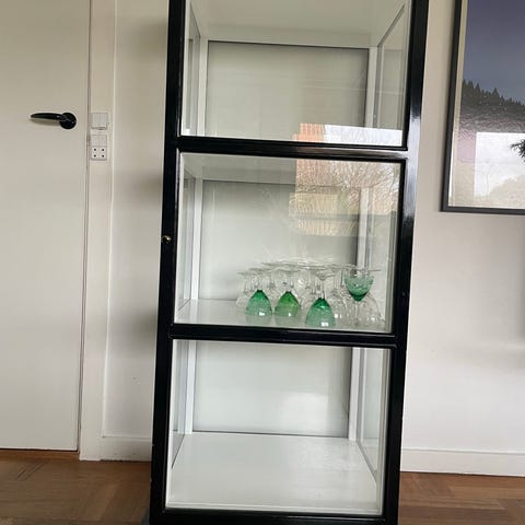 Mørkegrønt vitrineskab fra Hübsch med messingfarvet greb. 3 hylder. Fejler intet.