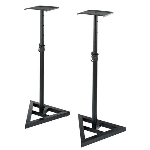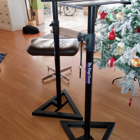 Billede 1: Sorte Supreme monitor stativer / højtalerstandere. Topplademål: 23 x 23cm. Højde: 96-136cm. 600kr.
