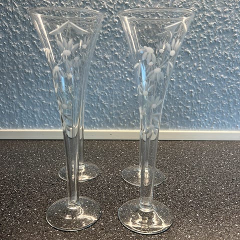 11 stk. mindre klare desserttallerkener i presset glas, ofte benævnt som “asietter” eller “kagetallerkener”. De er vintage-inspirerede og har et dekorativt mønster med duvende kant, som var populært fra midten af 1900-tallet, specielt til kage, dessert, eller små serveringer
