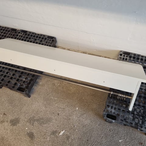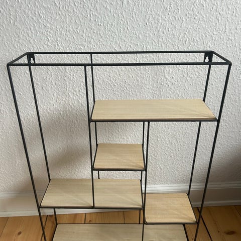 Flot og velholdt retro hylde. Der er en stang under med fastgjorte s-kroge.