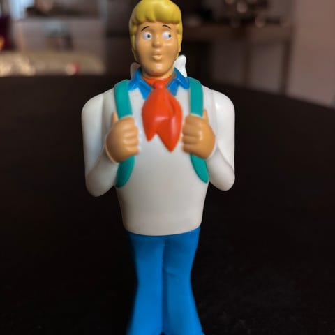 Figur af en mand iført hvid skjorte, blå bukser og turkis rygsæk. Figuren har blondt hår og et orange tørklæde. Materiale og størrelse ikke specificeret.