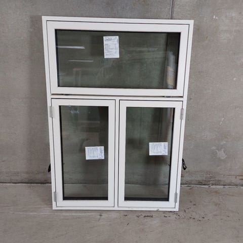 Sidehængt-topstyret vindue i træ/alu med 3-lags energiruder, friskluftsventil, anverfere, storkkroge og greb. De to nederste fag er sidehængte, det øverste er topstyret. Øverste fag måler højde 59cm. Der er udfræst not i alle fire sider for lysning o