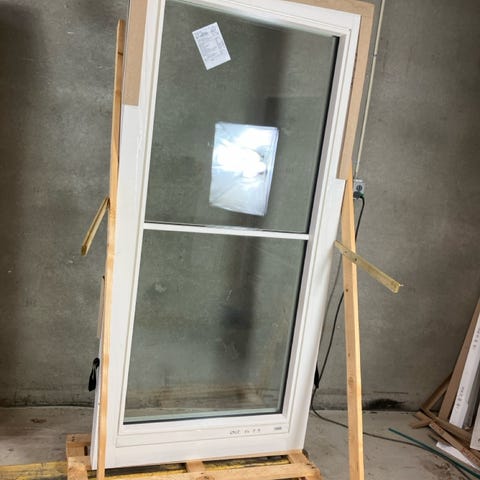 Dobbelt dreje-kip terrassedør i plast med 2-lags energiruder. Udført i GEALAN PVC profiler. Håndtag medfølger løst.