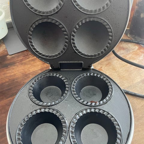 Mini Muffins Maker elektrisk køkkenapparat i blå farve. Designet til at bage små muffins med plads til flere portioner ad gangen. Kompakt størrelse og nem at betjene, egnet til hjemmebrug.