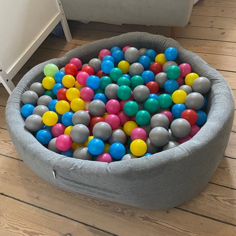Boldbassin med 223 bolde i to hvide, to lyserøde og en grå farve.
