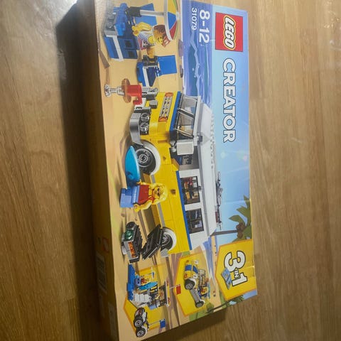 LEGO Creator 31079 - komplet, dog er rund glat erstattet med rund med knopper (bordplade) - se billedet. Uden betydning. Camper Van byggesæt med 3-i-1 funktion, der giver mulighed for at bygge en camper van, en food truck og en buggy. Sættet indeholder minifigurer og tilbehør som surfbræt, parasol og grill. Velegnet til børn og samlere, der ønsker at bygge og lege med forskellige modeller i samme sæt.
