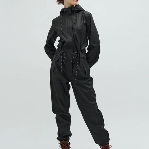 Klassisk sort denimdragt med lynlås foran, sidelommer og bælte i taljen, som giver en flot pasform.