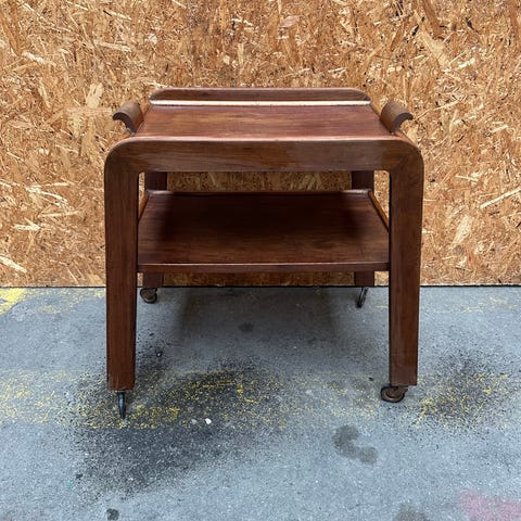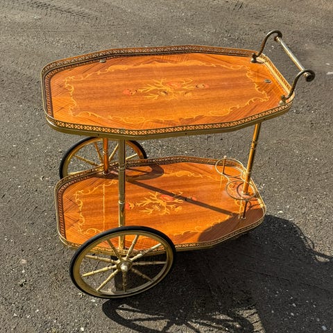 Barvogn - Rullebord med stel Overflader udført i intarsia af forskellige træsorter med blomstermotiv. Bundplade med flaskeholder. H: 67cm, B: 41 cm L: 74 cm.