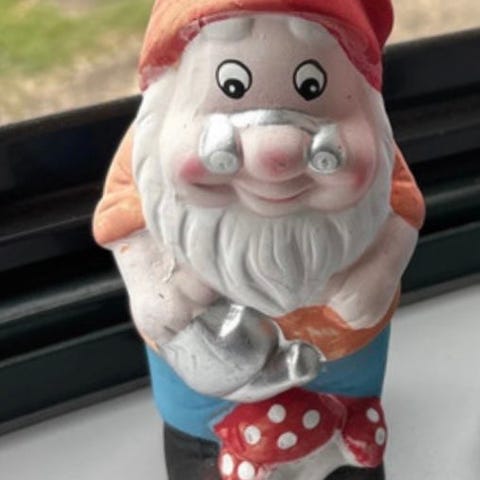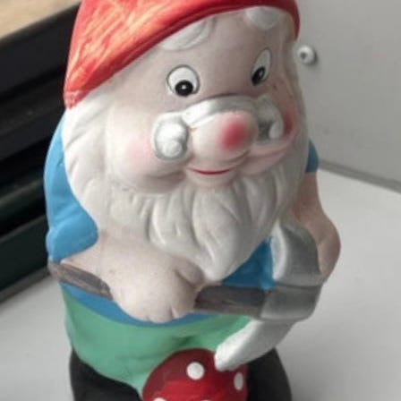Gl charmerende havenisse med skovl ca 18 cm m skøn patina