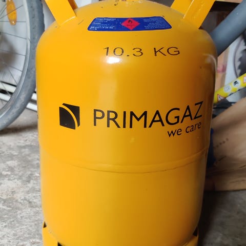 Har denne tomme gasflaske som nemt kan byttes til en fuld i byggemarkeder og tankstationer