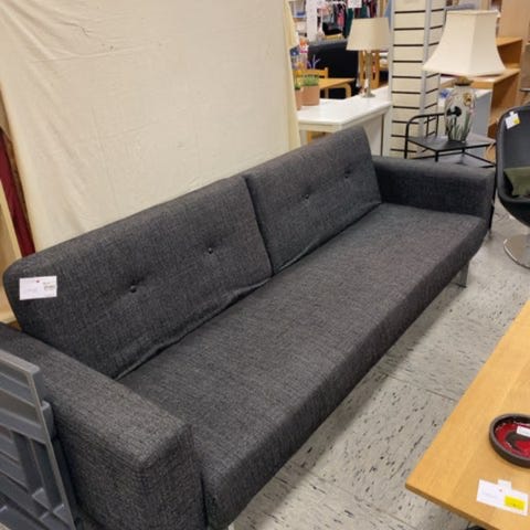 Sofaen har en blød polstring med kvadratisk mønster og brede armlæn. Den er fremstillet af tekstil og træben.,Afhentes i:,Røde Kors Kolding (621),Bemærk at mail, chat og beskeder ikke besvares, og varen skal købes på knappen "Gå til varen"