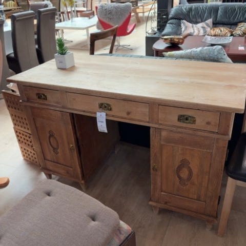 Skrivebordet har en rektangulær bordplade i en varm trælignende finish og en stabil metalbund i sort.,Afhentes i:,Røde Kors Kolding (621),Bemærk at mail, chat og beskeder ikke besvares, og varen skal købes på knappen "Gå til varen"
