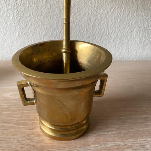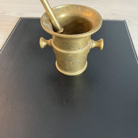 Morteren er lavet af messing og har en glat overflade med en stang til at male.