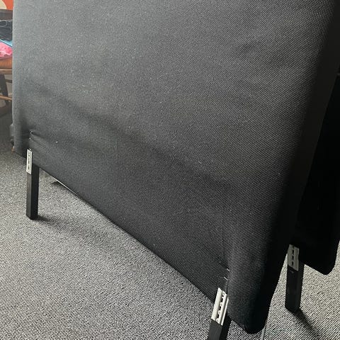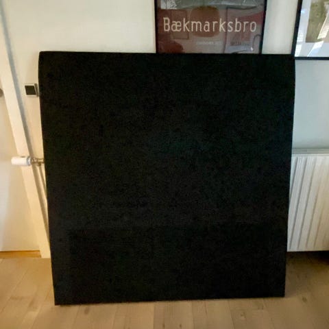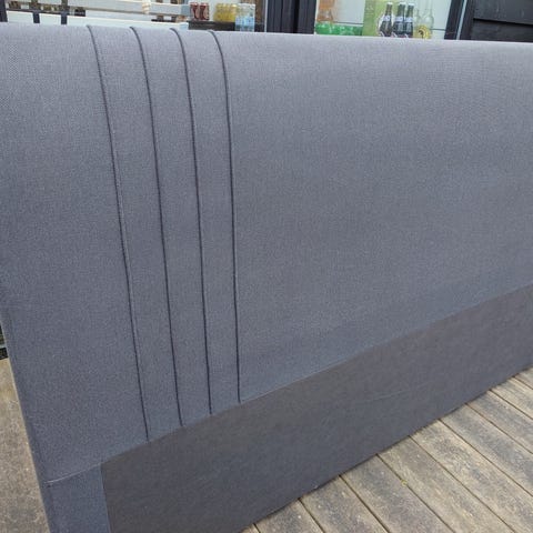 Jysk sengegavl i gråt stof med knapdetaljer. Bredde på 120 cm.