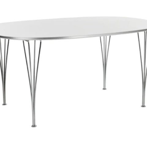 Super Ellipse spisebord, brun laminat bordplade med alukant monteret med spændben af forkromet stål. To tillægsplader á 60 cm. Det betyder, at bordet kan indstilles i tre længder: 180/240 og 300