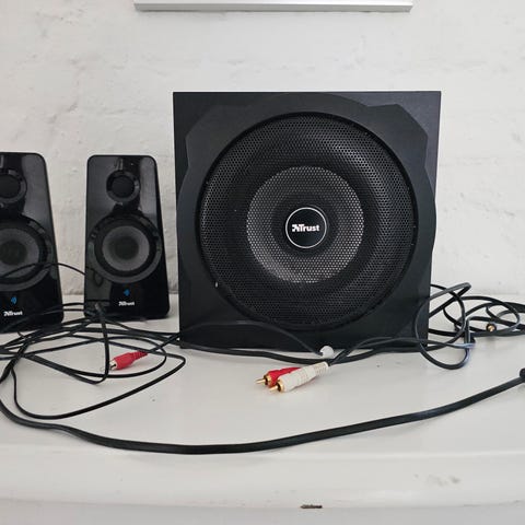 Subwoofer med forstærker og 5 surround-højttalere med fjernbetjening og alle nødvendige ledninger.Hvis du vil have god lyd fra mobil, smart-phone, pc, cd eller lignende, er her et god bud.