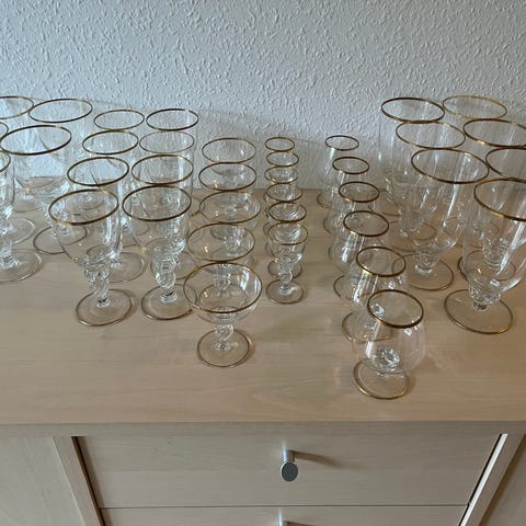 Glas, Lyngby mågeglas, 2 stk., krystalglas, med hånddrejet stilk, 21 karat guld på mundrand og fodplade og med håndgraveret måger ind i selve glasset, uden skår.