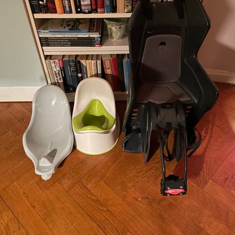 Bumprider børnesæde med tilhørende beslag og monteringsdele. Sædet er designet til børn og har en sort farve. Materialet består af plast. Sædet kan monteres på kompatible klapvogne eller barnevogne fra Bumprider.
