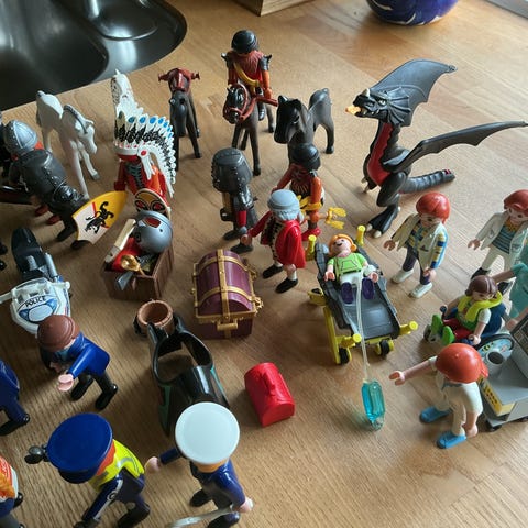 1 stor pakke med blandet tilbehør, figure, heste, karret mm. 150 kr.